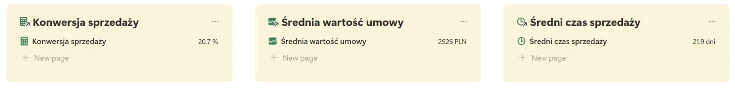 Ok, no to lecimy – na samej górze mamy trzy żółte kafelki, które pokazują konwersję, średnią wartość umowy oraz średni czas trwania procesu sprzedaży.
