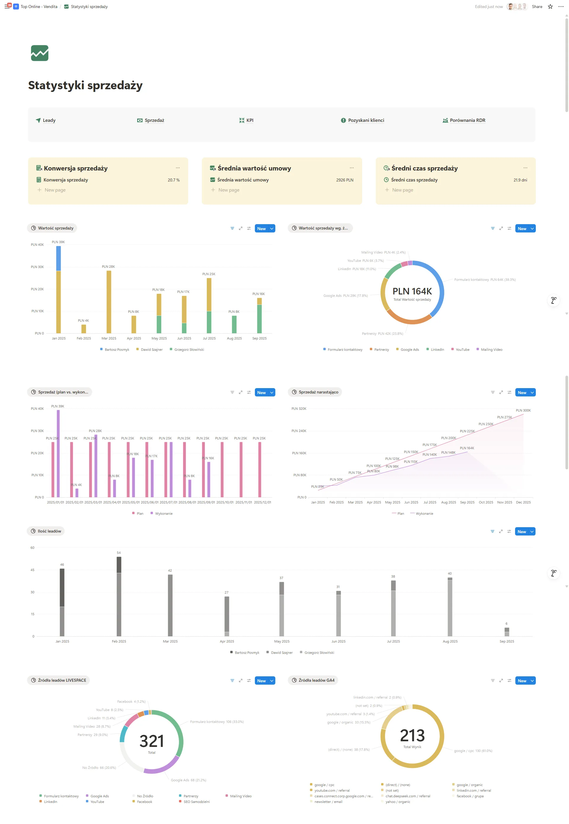 Pierwszy z nich pokazuje sprzedaż w każdym miesiącu z podziałem na handlowców, a obok – wykres kołowy prezentujący wartość sprzedaży z podziałem na źródła leadów.