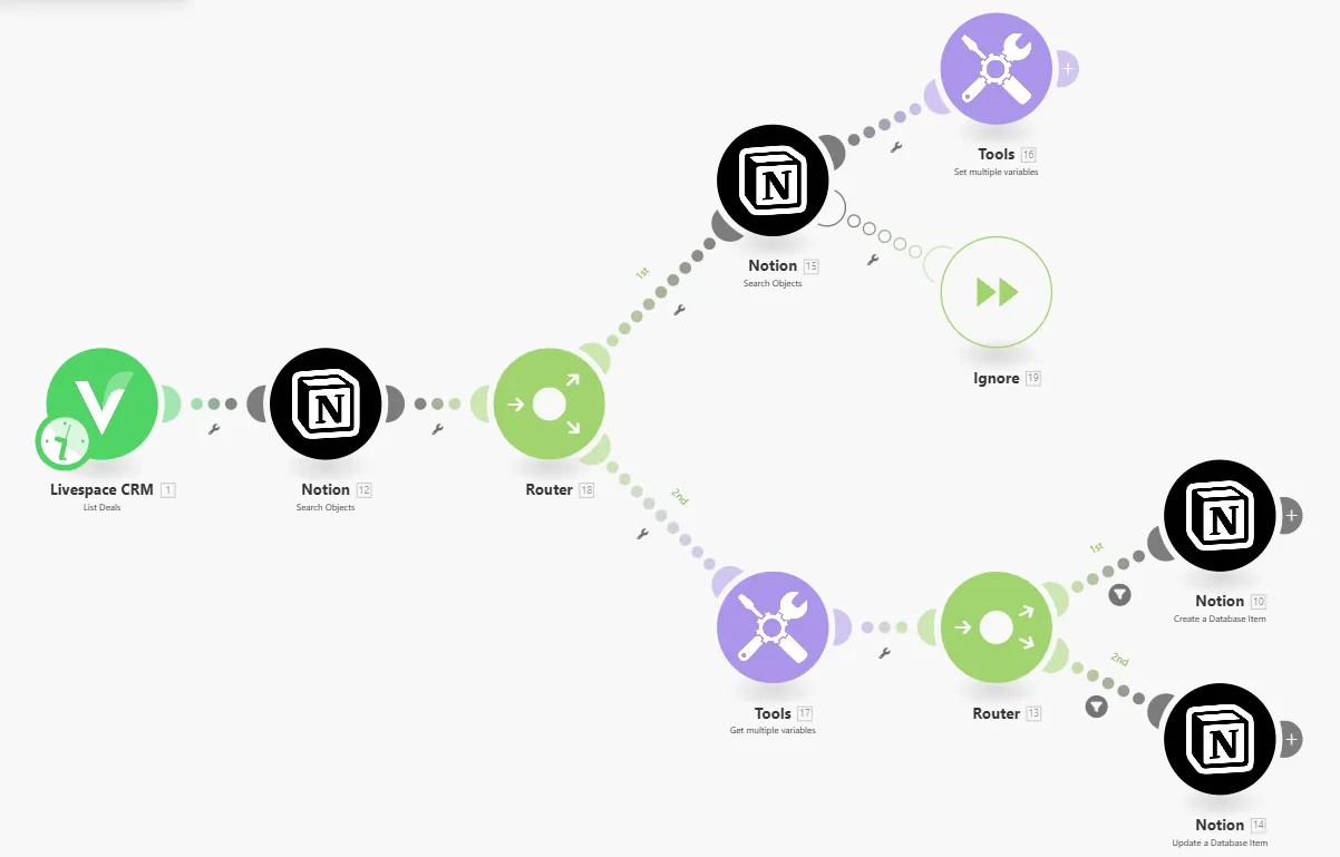 Dane z CRMa pobieramy przez API bezpośrednio do tabel, a dane z GA w formacie CSV automatycznie trafiają do Notion dzięki prostym integracjom.