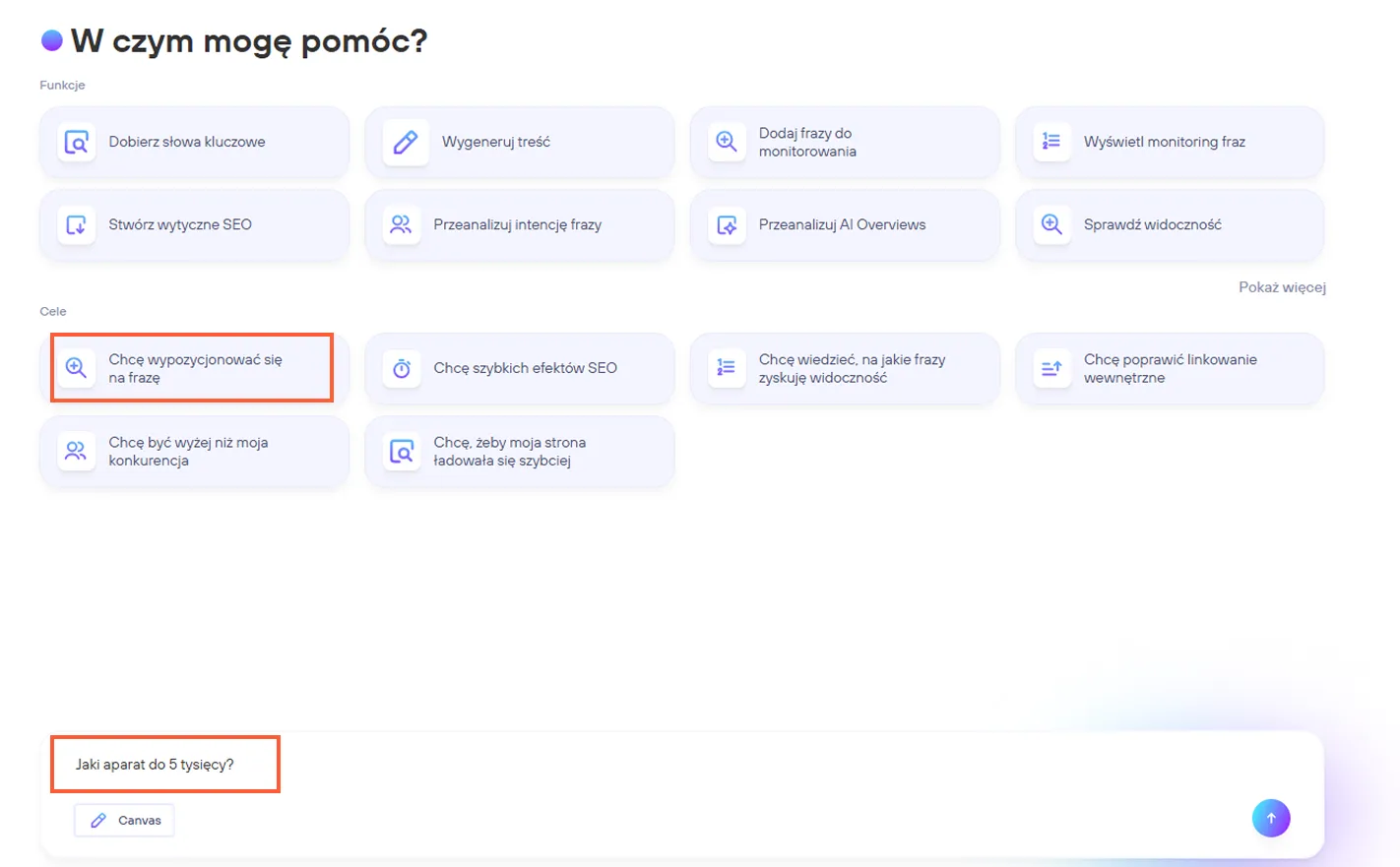Cały proces zaczynam od wyboru frazy kluczowej, na którą chcę być widoczna, na przykład „jaki aparat do 5 tysięcy”. Opcjonalnie mogę też samodzielnie napisać polecenie – „Przygotuj artykuł o (…)”.