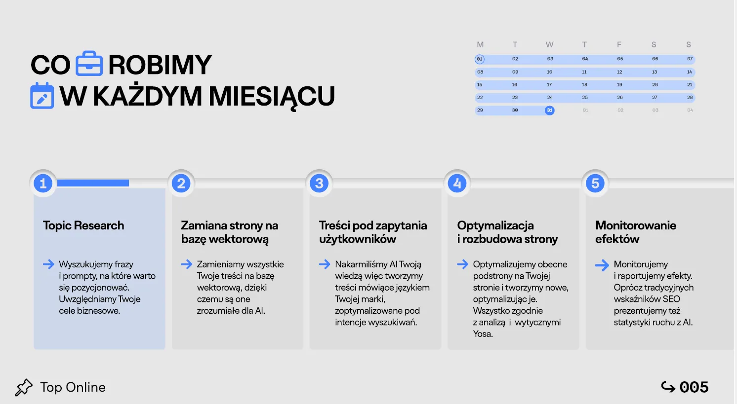 Dla nas był to przełomowy moment. Każdy taki chaos rynkowy burzy stary porządek, ale jednocześnie daje szansę na zbudowanie czegoś nowego. I właśnie z tej perspektywy zaczęliśmy na nowo myśleć o sprzedaży SEO. W Top Online od 3 lat przygotowywaliśmy się na zmiany, zaczynając od tworzenia narzędzi, które pomogą nam pozycjonować klientów w LLM-ach, przez doskonalenie procesu sprzedaży, aż po realizację działań w praktyce.