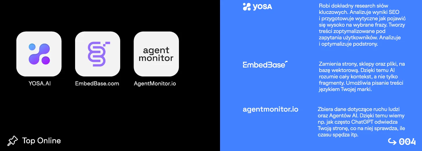 Takiego workflow nie dałoby się wdrożyć bez odpowiedniej technologii. Rynek nie oferował narzędzi, których potrzebowaliśmy, więc… zaczęliśmy budować własne. Od dwóch lat rozwijamy Yosę – agenta AI do SEO, który dziś obsługuje wszystkich naszych klientów. Do tego doszedł EmbedBase, który pozwala zamieniać treści w bazę wektorową, oraz AgentMonitor, dzięki któremu wreszcie możemy skutecznie mierzyć ruch z LLM-ów i raportować go klientom.