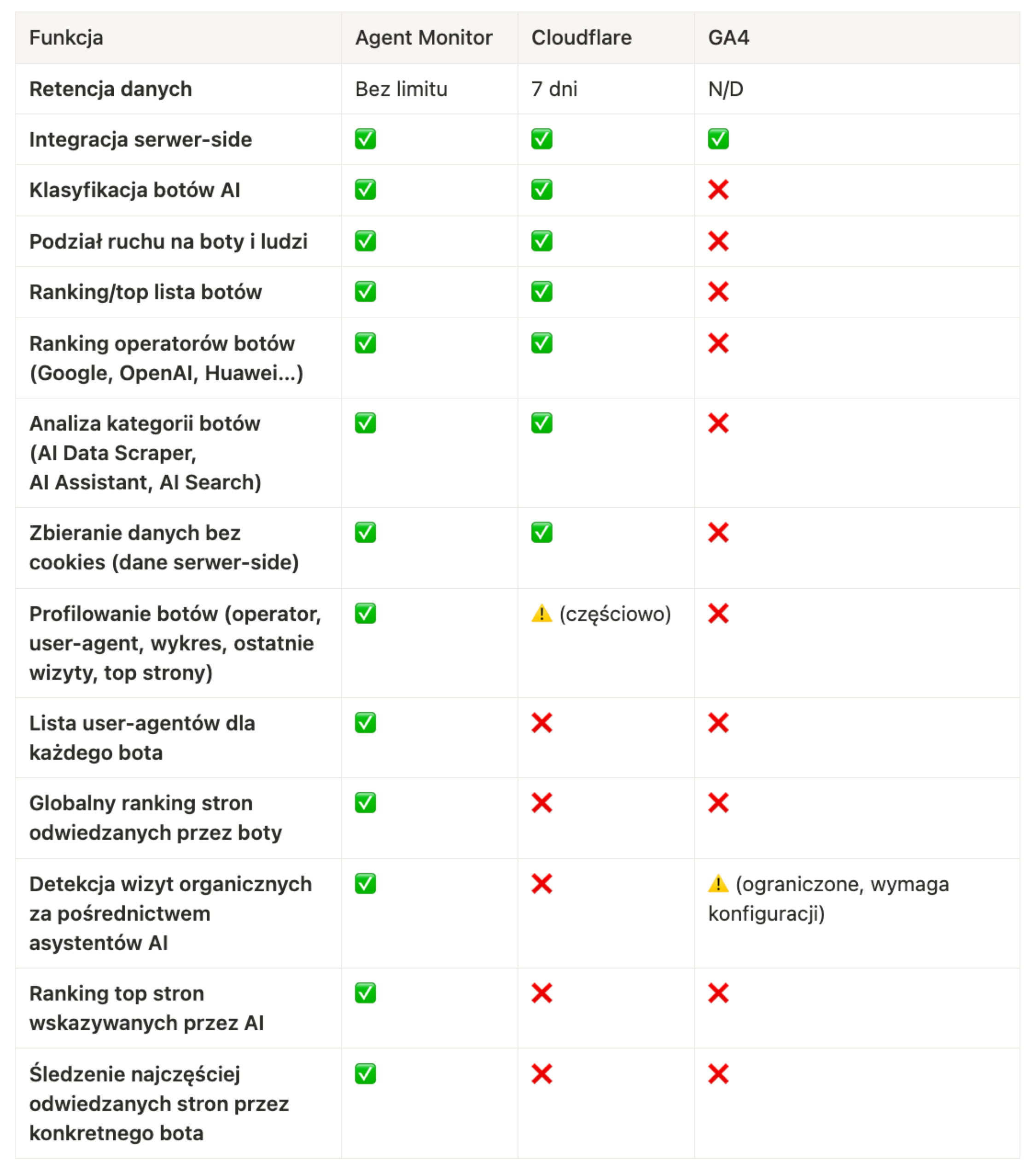 Najprościej mówiąc: GA4 i Cloudflare widzą tylko to, co mają zobaczyć. AgentMonitor wyłapuje to, co naprawdę przechodzi przez stronę.