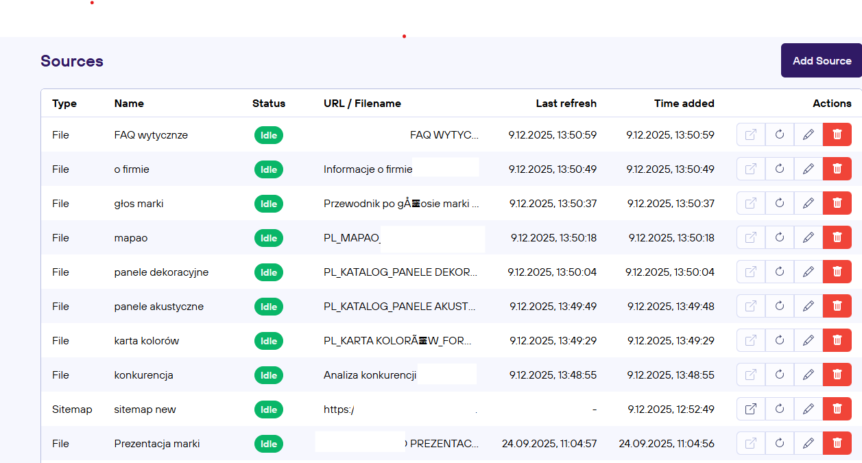 Działa to tak, że wrzucamy do niego ebooki, PDF-y z ofertą, prezentacje, transkrypcje podcastów, wywiady, stare artykuły, notatki z warsztatów – wszystko, co może się przydać i zawiera przydatne informacje o marce i jej doświadczeniu. Nie zapominamy też o samej stronie, biorąc do bazy wszystkie URLe dostępne w sitemapie serwisu.
