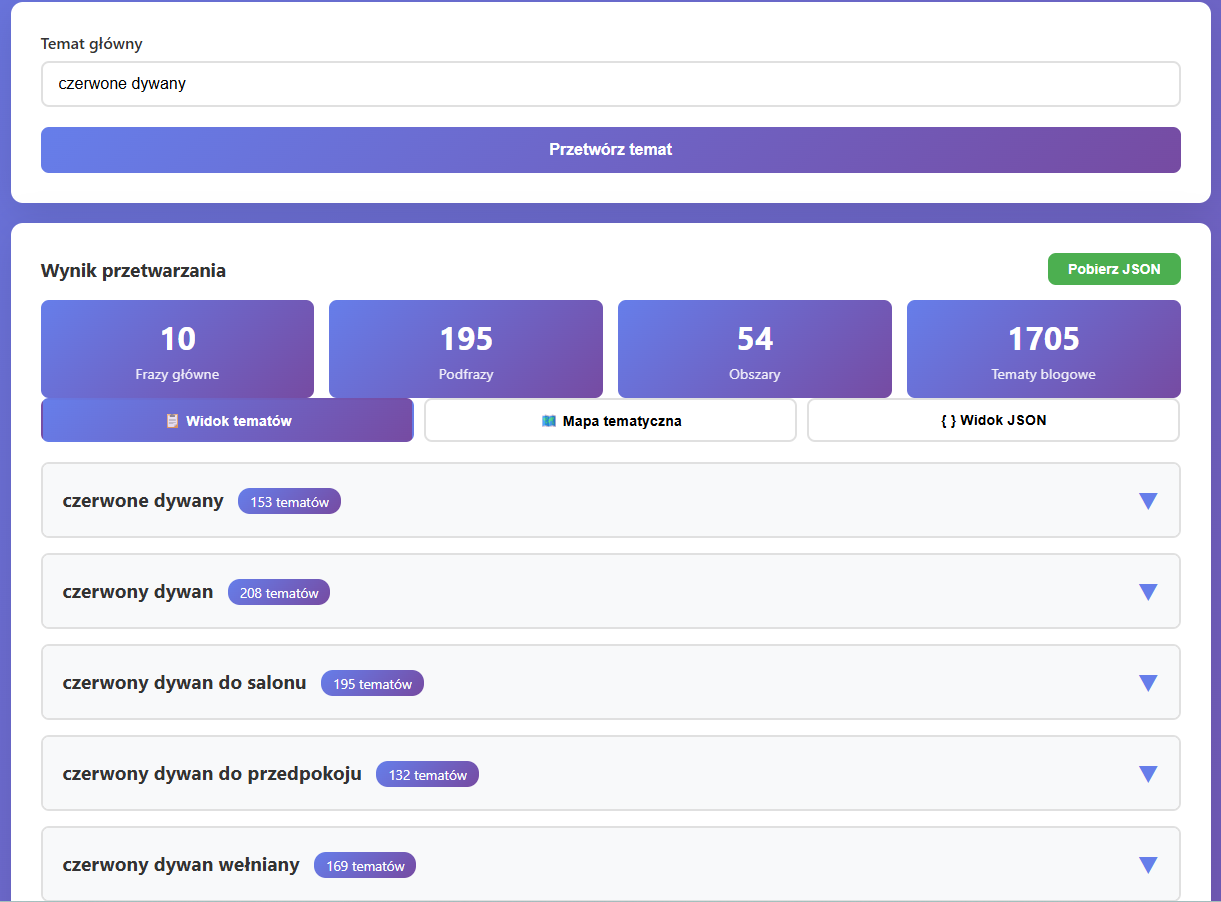Teoretycznie to pierwszy etap, ale w praktyce to właśnie nad nim pracujemy najmocniej. Nasz cel był prosty: w kilkadziesiąt sekund dostać setki pomysłów na tematy powiązane z jedną frazą kluczową.