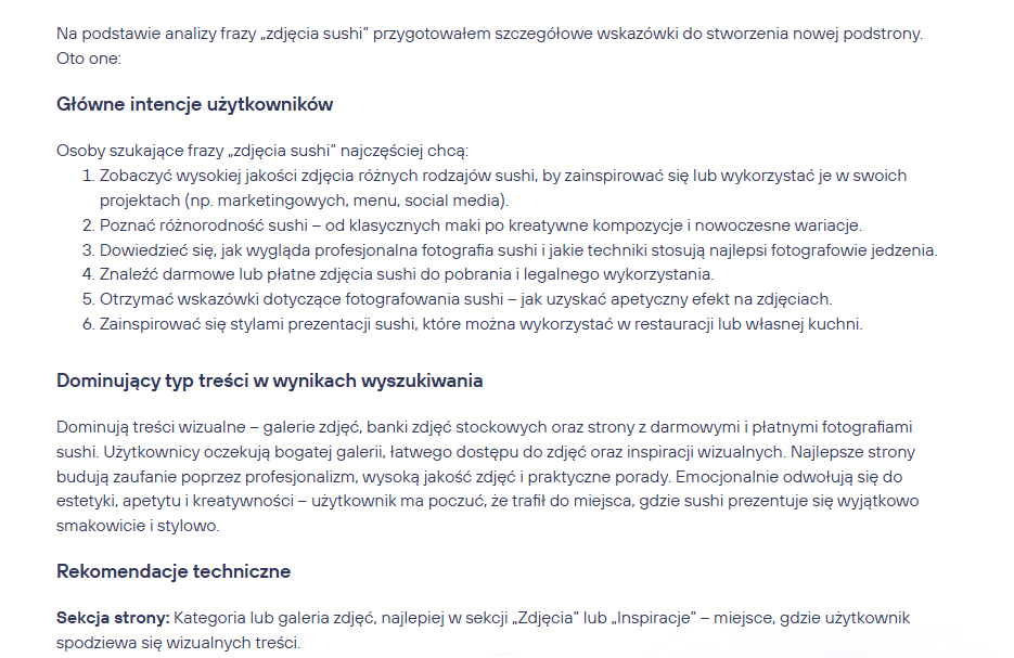 I to jest prawdziwy game-changer, bo nie wpisujemy prompta „Stwórz mi artykuł…” w ChacieGPT, tylko opieramy się na dopracowanym procesie. Finalnie tekst ma nie tylko najważniejsze frazy kluczowe, ale też pytania i odpowiedzi, których ludzie szukają w wyszukiwarce – a to zwiększa szanse na cytowanie w AIO.