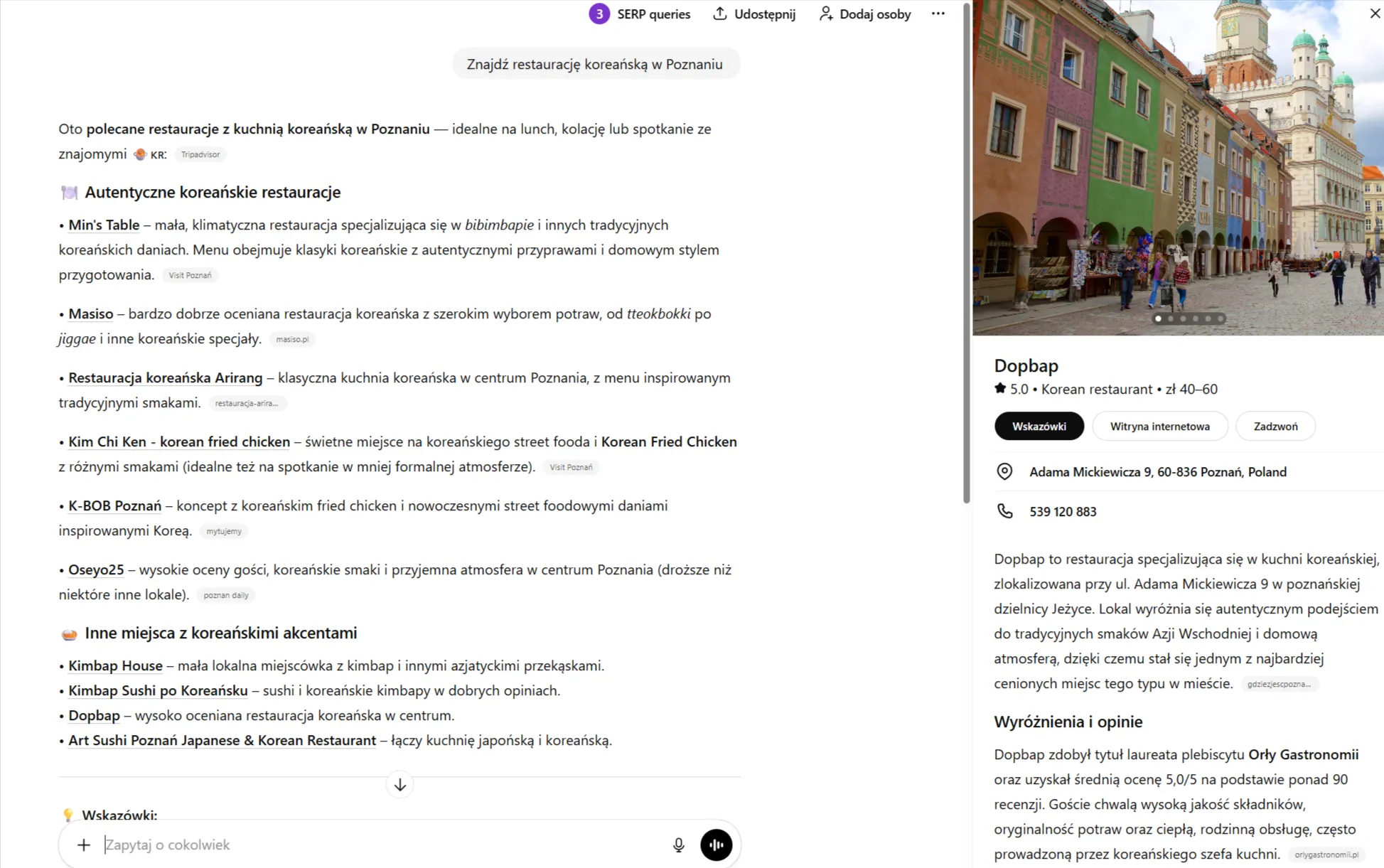 Jak to wygląda w praktyce? Gdy zapytasz ChatGPT o restaurację, firmę usługową albo konkretne miejsce, a następnie klikniesz nazwę obiektu w odpowiedzi, po prawej stronie interfejsu może pojawić się panel z dodatkowymi informacjami.