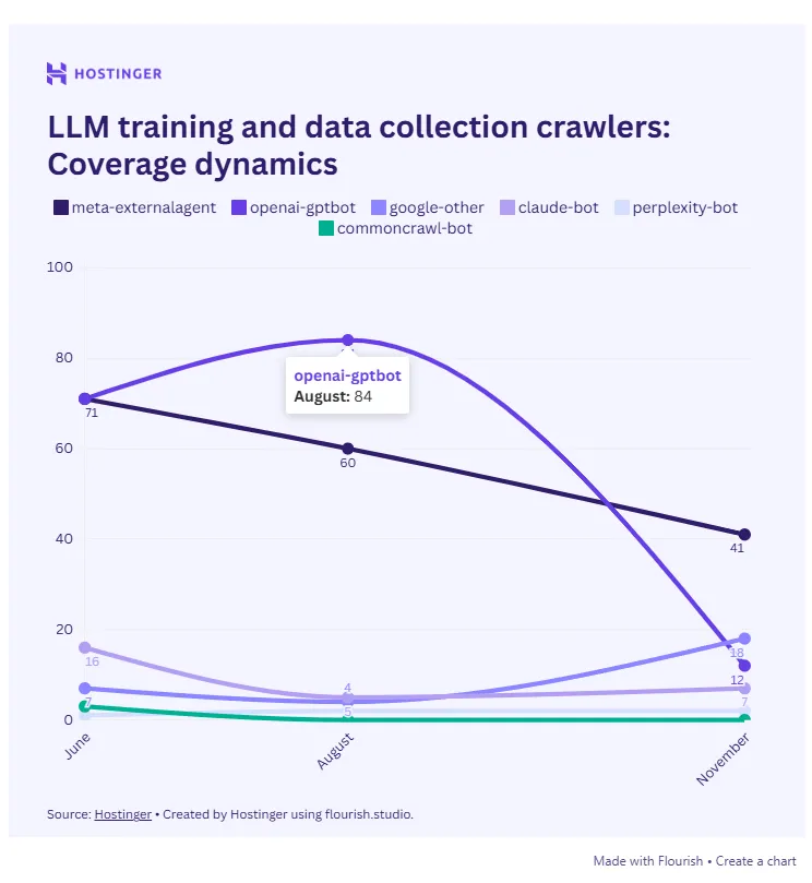 Hostinger przeanalizował 66,7 miliarda interakcji botów na 5 milionach stron, a wnioski są następujące: boty treningowe takie jak GPTBot są masowo blokowane, przy czym boty asystujące (które odpowiadają użytkownikom w narzędziach AI) mają coraz większy dostęp do stron.