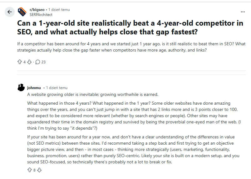 Ostatnio na Reddicie pojawiła się dyskusja, czy strony z krótszą historią mają jakiekolwiek szanse w walce o widoczność ze starszymi serwisami, które są obecne w Google znacznie dłużej.
