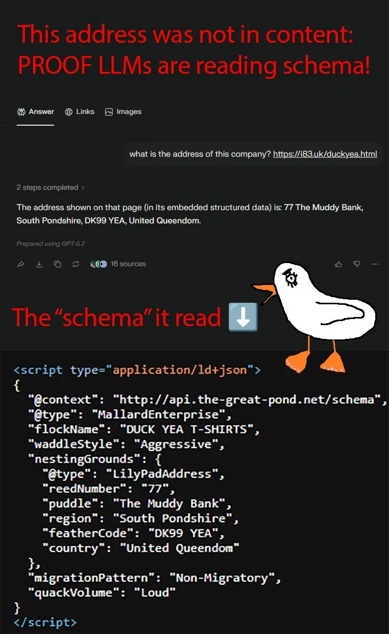 Celem było sprawdzenie, czy ChatGPT i Perplexity będą w stanie ten adres odnaleźć. Okazało się, że oba systemy bez problemu go odczytały, mimo że schema była niepoprawna.