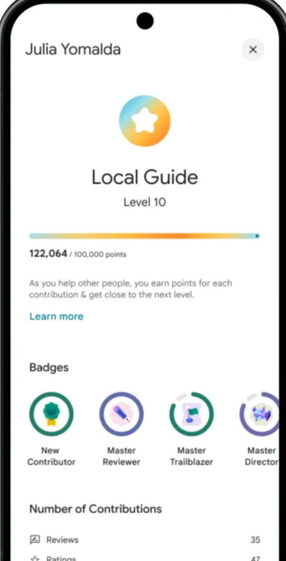 - Zmiany w programie Lokalnych Przewodników, czyli systemie nagradzającym najbardziej aktywnych użytkowników – Google odświeżył jego wygląd i teraz wyraźniej eksponuje zdobywane punkty i poziomy, a najbardziej zaangażowane osoby wyróżnia specjalnymi oznaczeniami widocznymi przy opiniach. Ma to zwiększyć ich wiarygodność i przyciągać uwagę innych użytkowników.